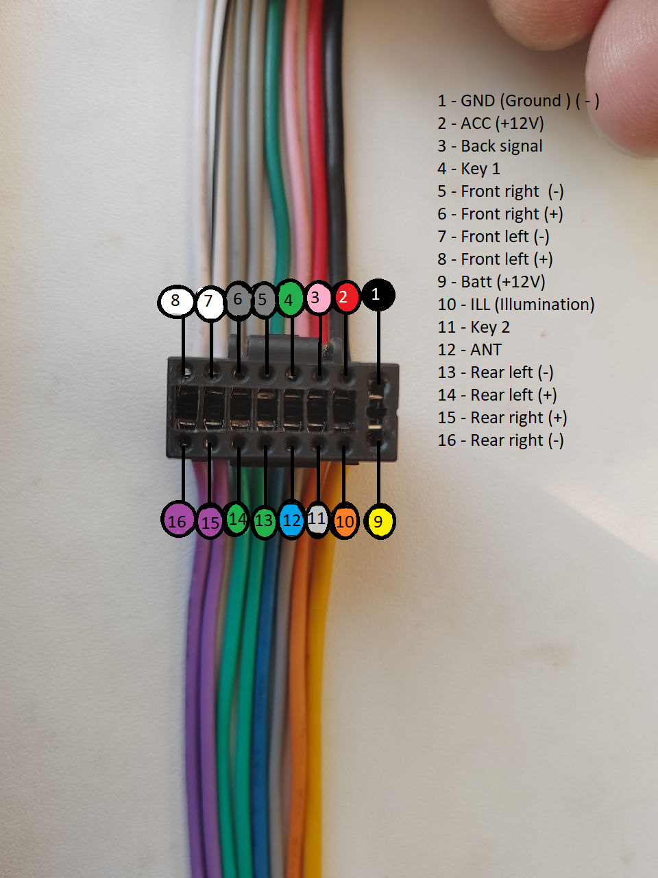 Такой разъем и распиновку имеют большинство андроид магнитол, так же встречаются и другие - можно попробовать найти разъем и распиновку для своей магнитолы тут my2din. Но чаще всего даже если распиновка отличается, по цветам проводов можно определить какая пара отвечает за тот или иной вывод звука.