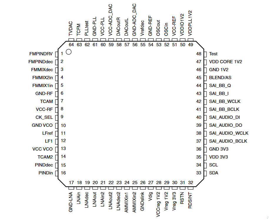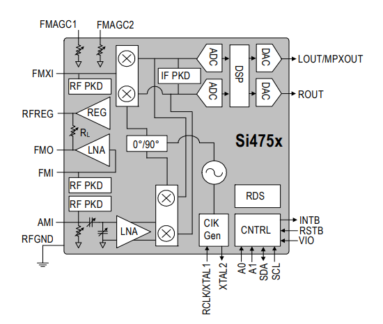 - Настраиваемые выводы GPIO для RDS, прерывания состояния качества и общего ввода-вывода, управляемого по шине I2C.