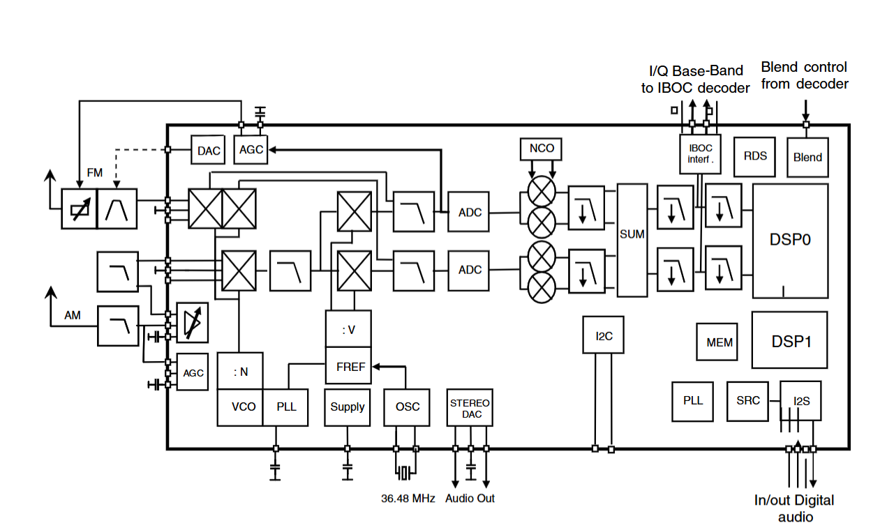 FM\AM - входы, синтезатор настройки, фильтрация каналов, эквализация FM - каналов, улучшение многолучевого распространения FM - сигнала, демодуляция, FM - стереокодирование, обработка слабых сигналов, подавление шума и RDS, а так же обеспечивает интерфейс для демодулятора\декодера