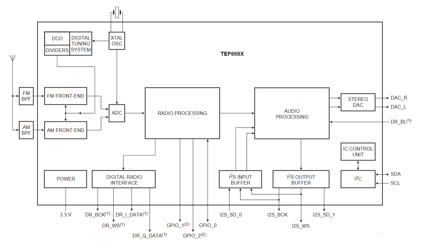 - Выход I2S базовой полосы TEF6688, поддерживающий HD Radio и DRM, с внешним цифровым радиосопроцессором (SAF356X или SAF360X).